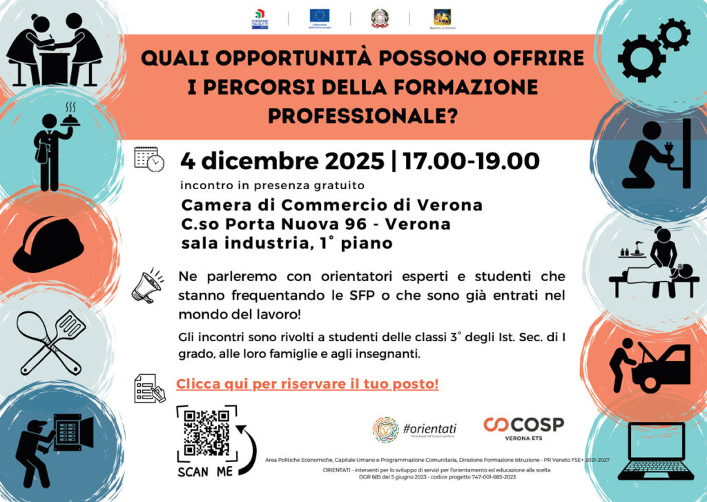 Giovedì 4 dicembre dalle 17.00 alle 19.00 presso la Camera di Commercio di Verona, C.so Porta Nuova (sala Industria) si terrà un incontro sulle opportunità formative offerte delle Scuole di Formazione Professionale